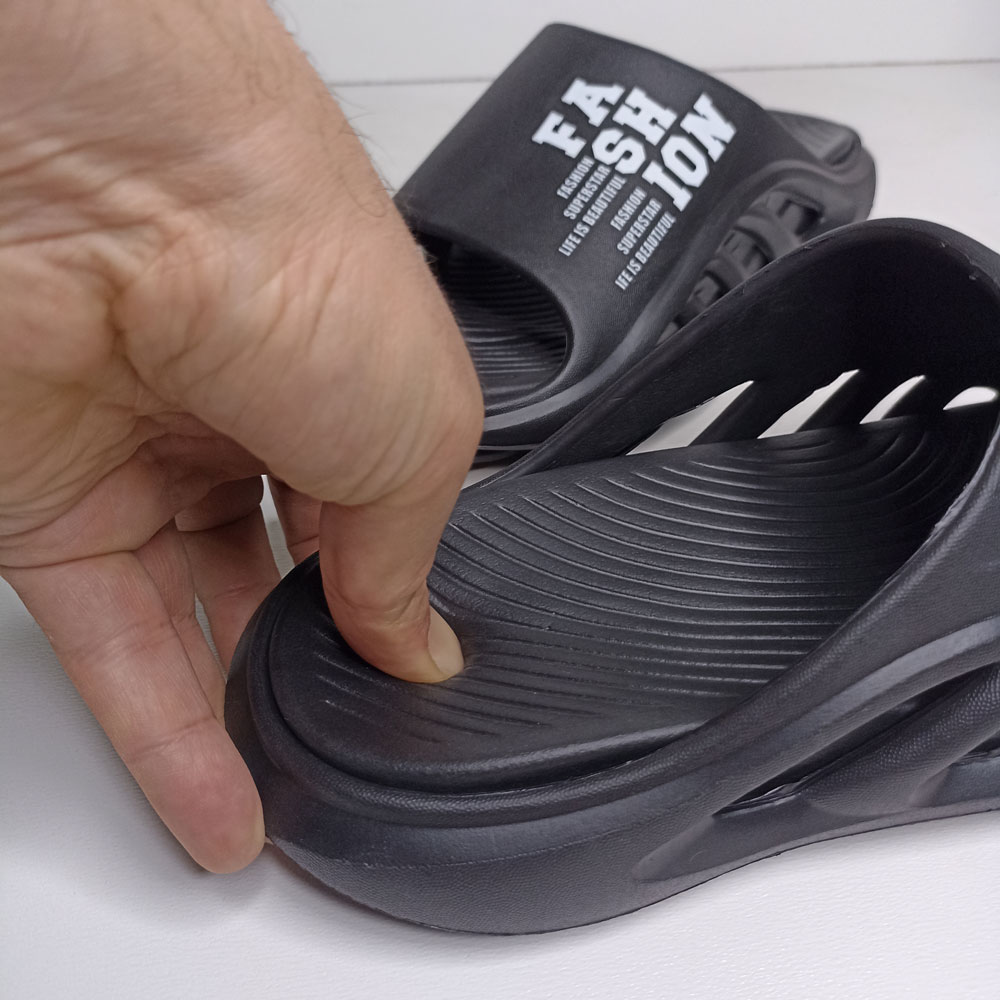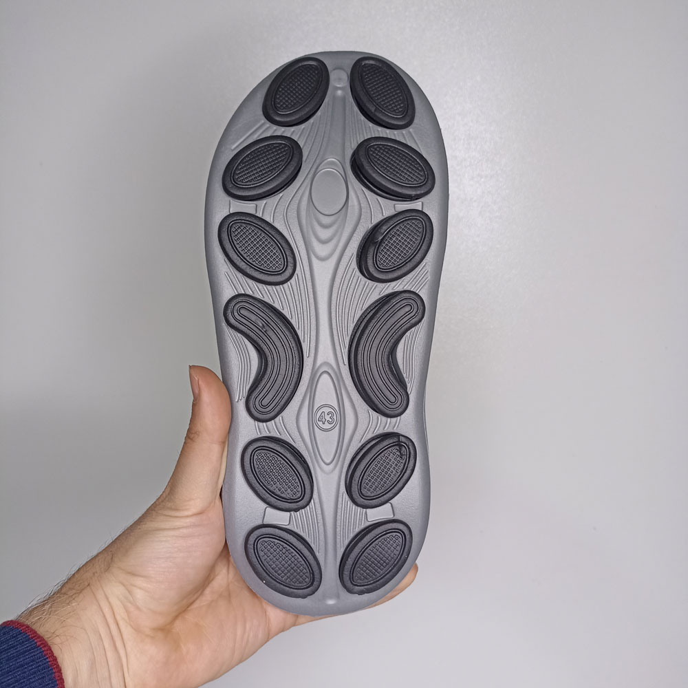 این دمپایی به صورت دو تکه تولید شده است. قسمت بیرونی از متریال مقاوم در برابر سایش و کفش داخلی از EVA نرم و بسیار راحت و به صورت ایرگونومیک (دارای برجستگی) جهت طبی بودن و ایجاد راحتی بیشتر میباشد.