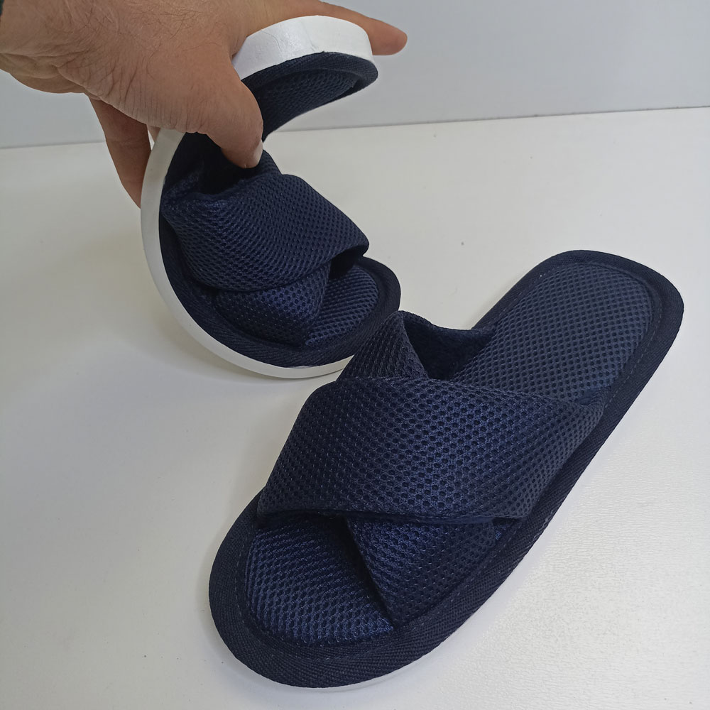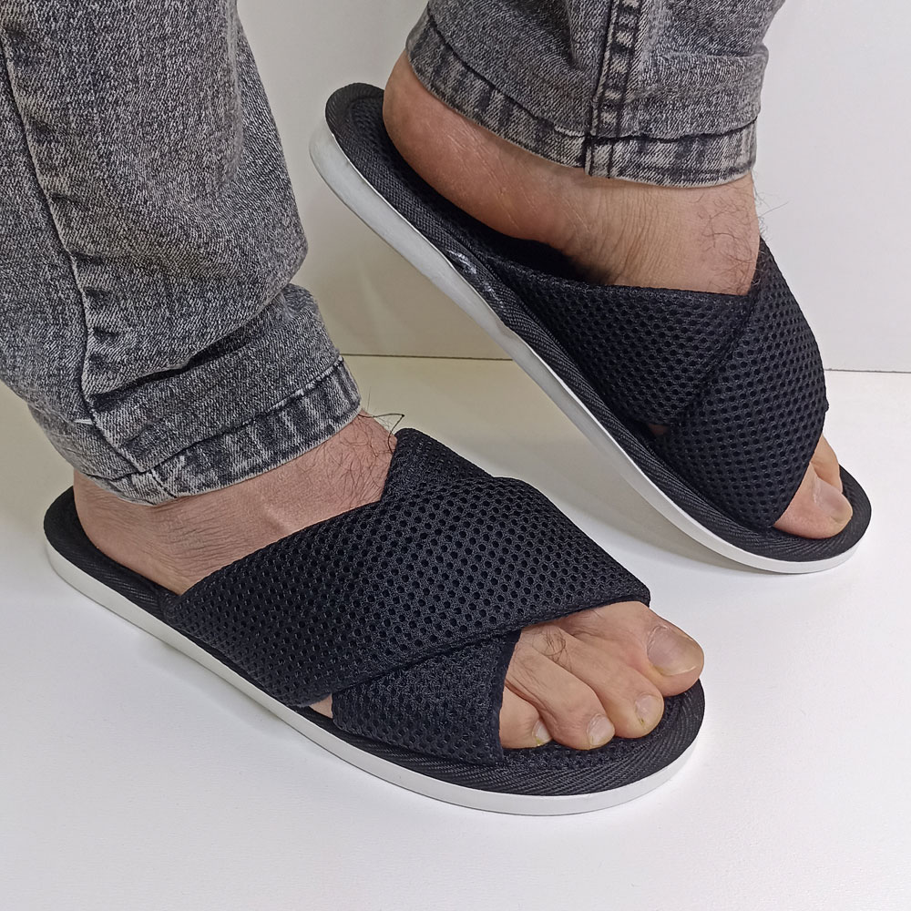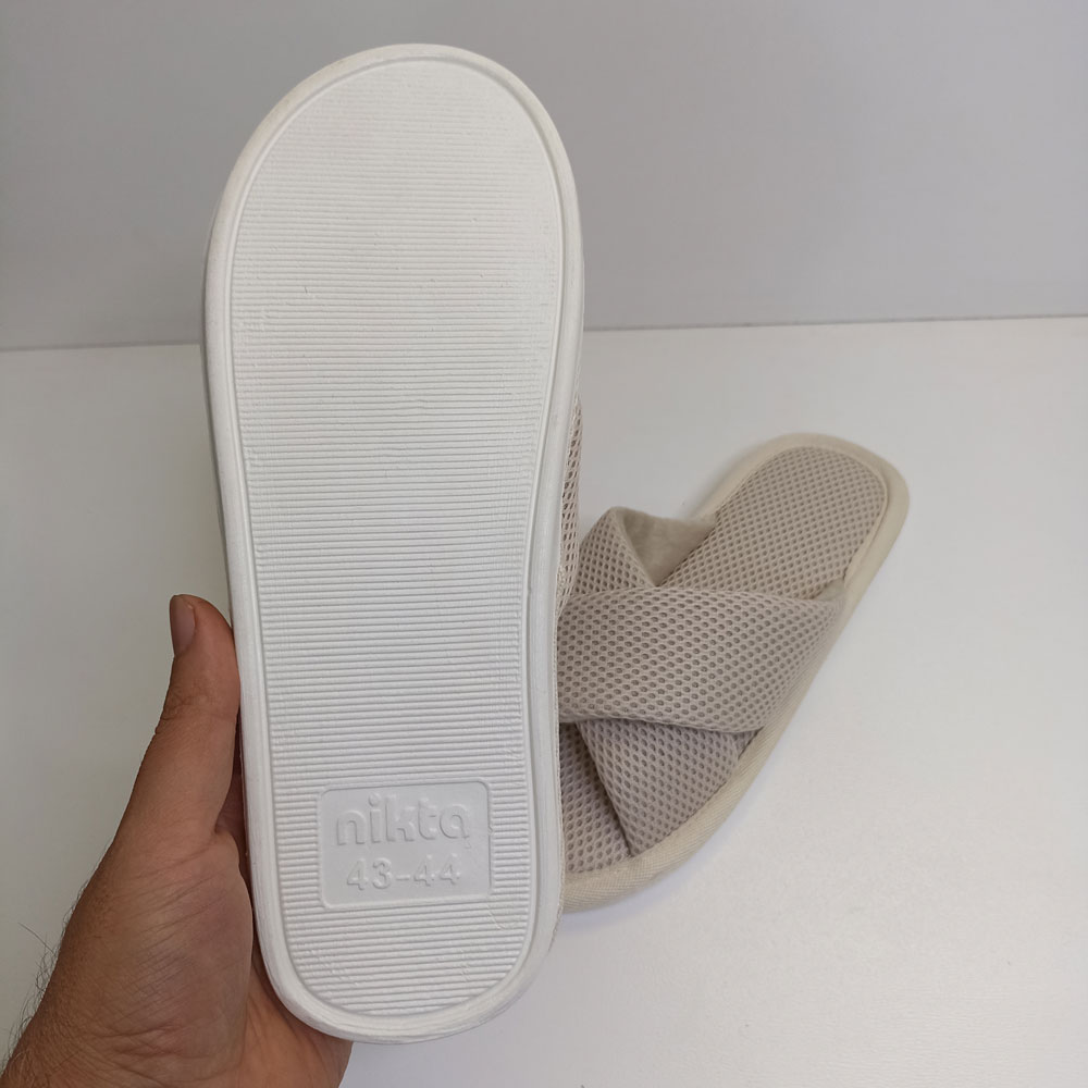 دمپایی حوله ای مردانه نیکتا مدل ضربدری توسط برند خوشنام ایرانی نیکتا طراحی و تولید شده است. قسمت داخلی از جنس پارچه حوله ای (پتویی) و سایر قسمت ها از جنس پارچه مشبک لانه زنبوری که باعث جلوگیری از تعرق پوست ما میشود، است.