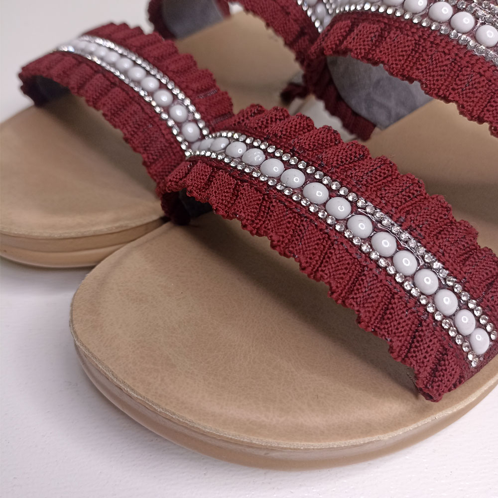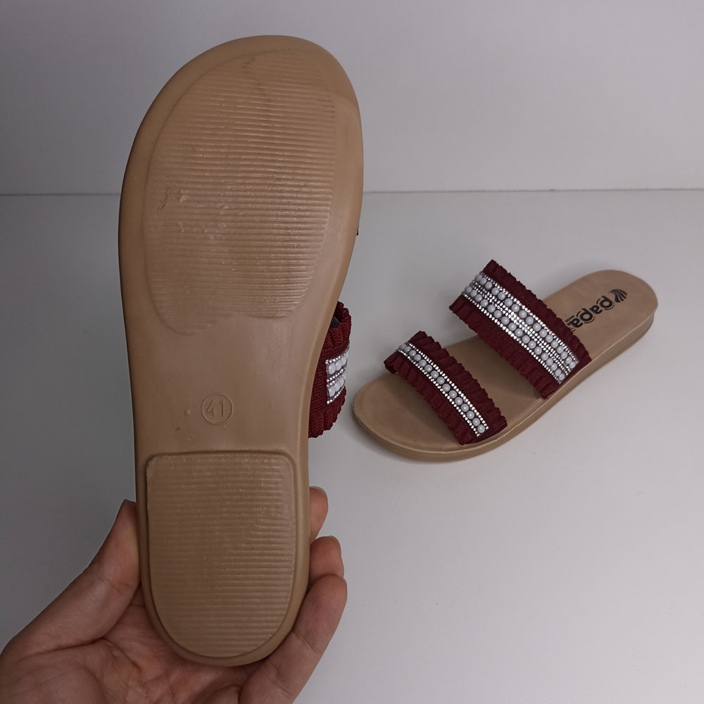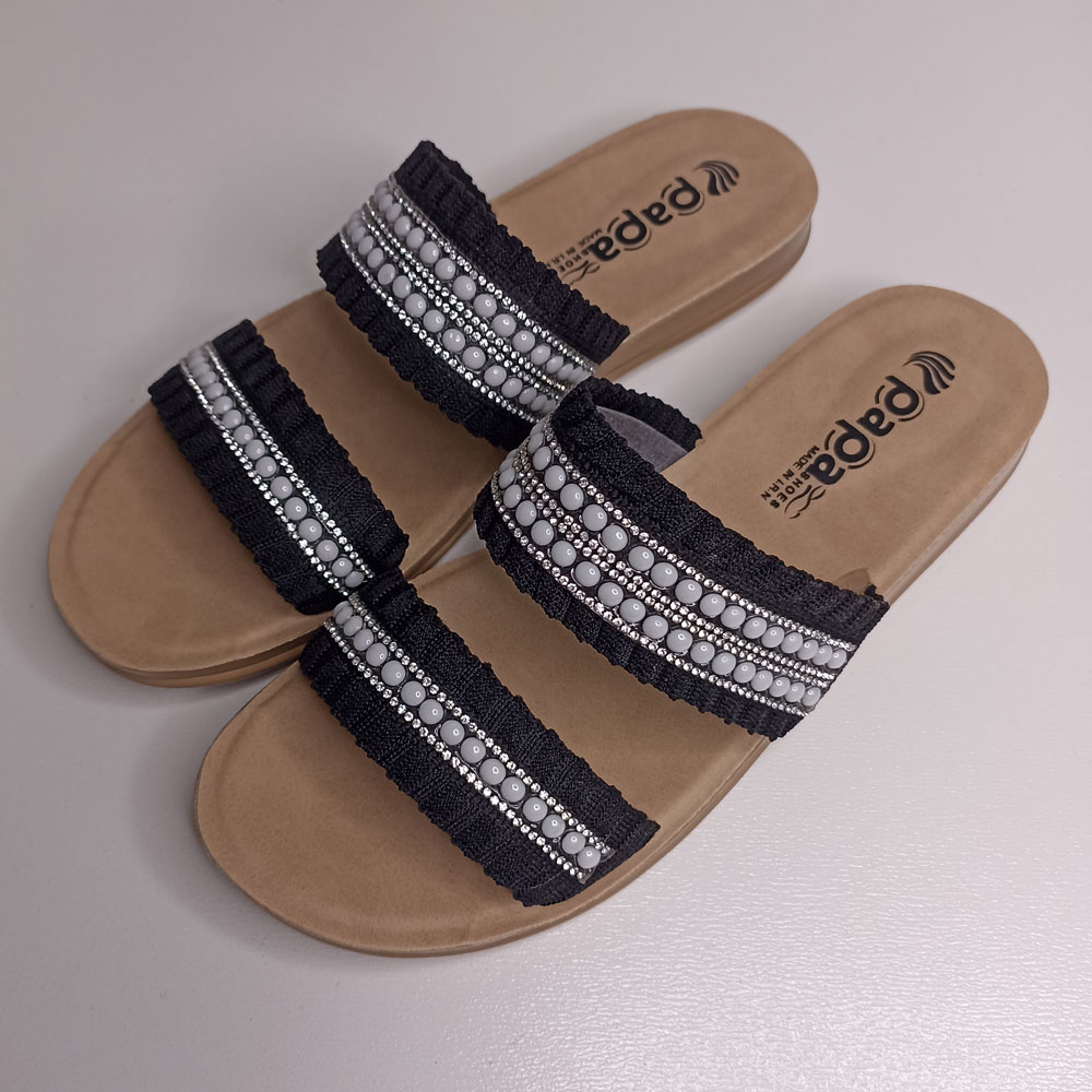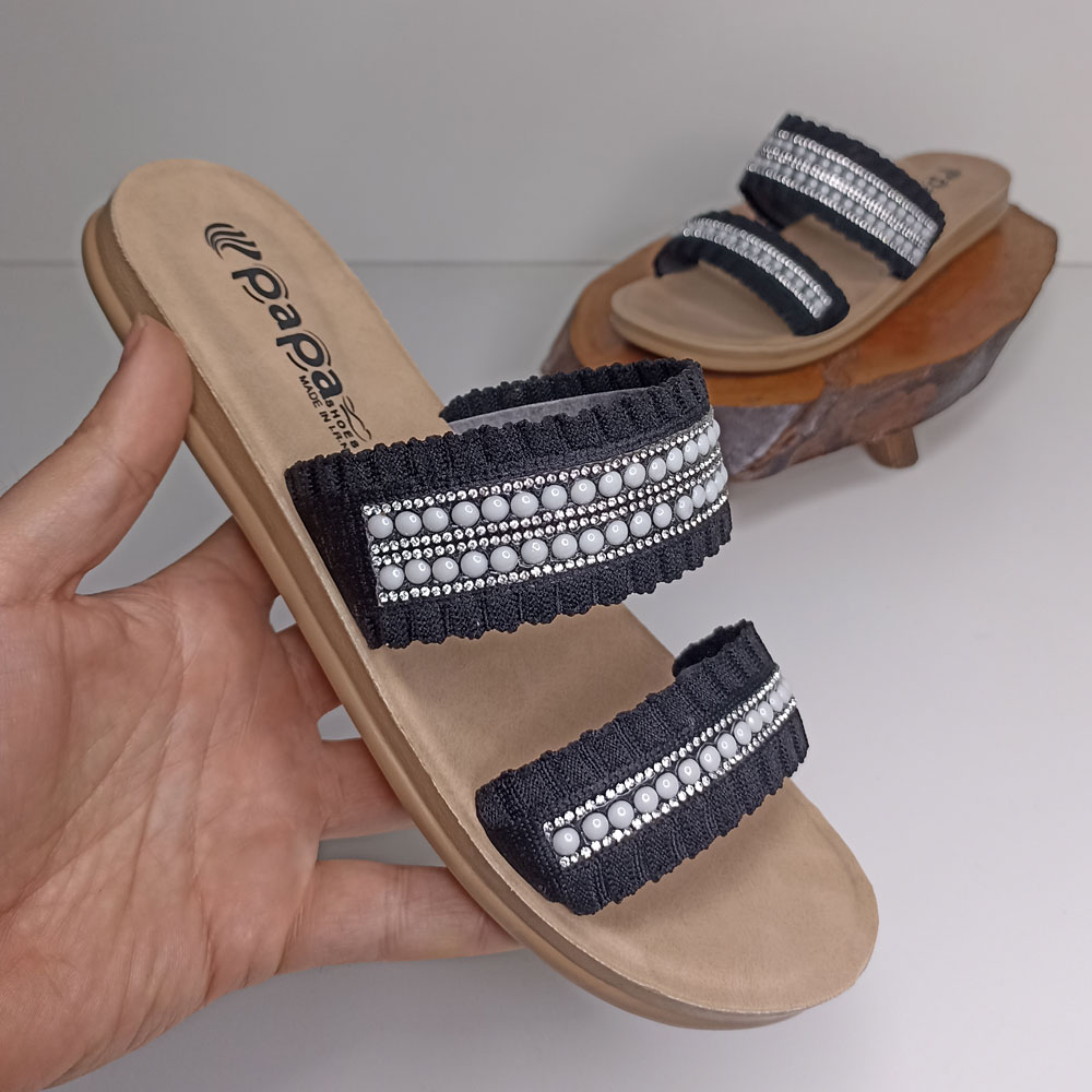 صندل روفرشی زنانه پاپا مدل تابان کد 1628 توسط برند خوشنام و خوب ایرانی پاپا طراحی و تولید شده است. زیره این صندل از جنس PU و رویه آن از جنس پارچه و تزیین شده با نگین و مروارید است در قسمت داخلی رویه یک آستر لطیف برای راحتی پوست پا کار شده است. کف این دمپایی نرم و راحت است.