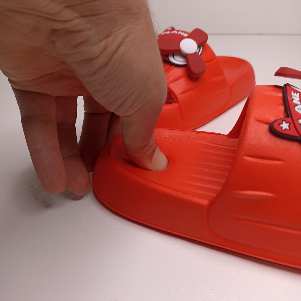 استفاده از متریال EVA سبب میشود محصول نهایی سبک و نرم باشد. در قسمت رویه این دمپایی یک استیکر پلاستیکی بسیار جذاب چرخنده کار شده است.